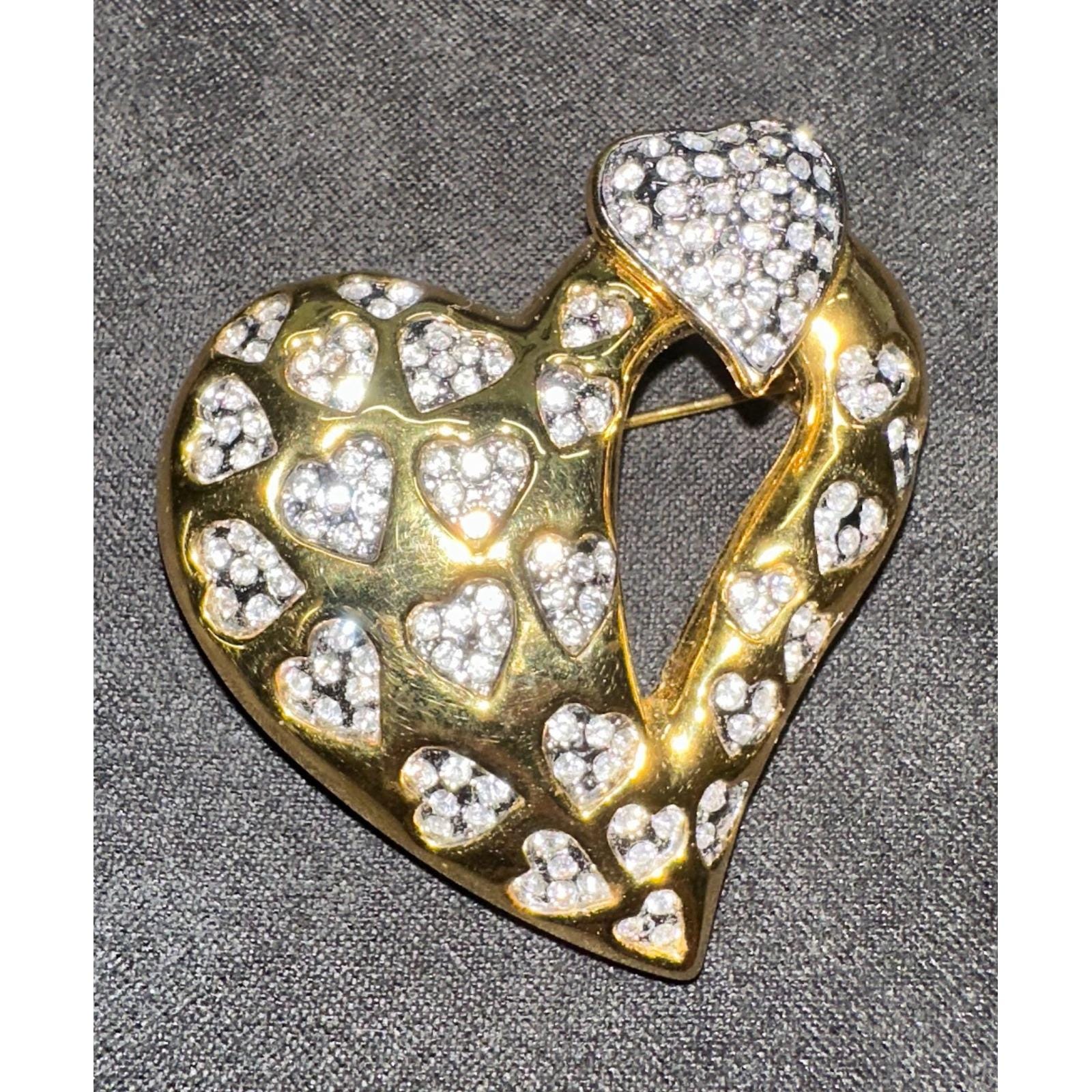 Vintage Gold Tone Heart Rhinestone Brooch Pavé Hearts Open Heart Pin Romantic